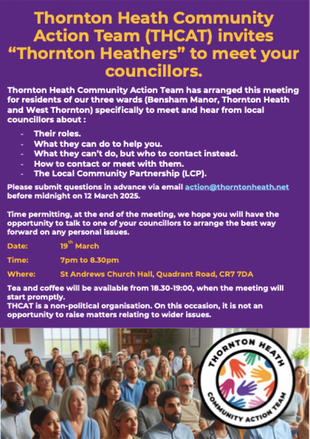 To help structure the session, we’d love you to submit questions in advance to action@thorntonheath.net. Time allowing, there’ll also be a chance to ask questions on the night.