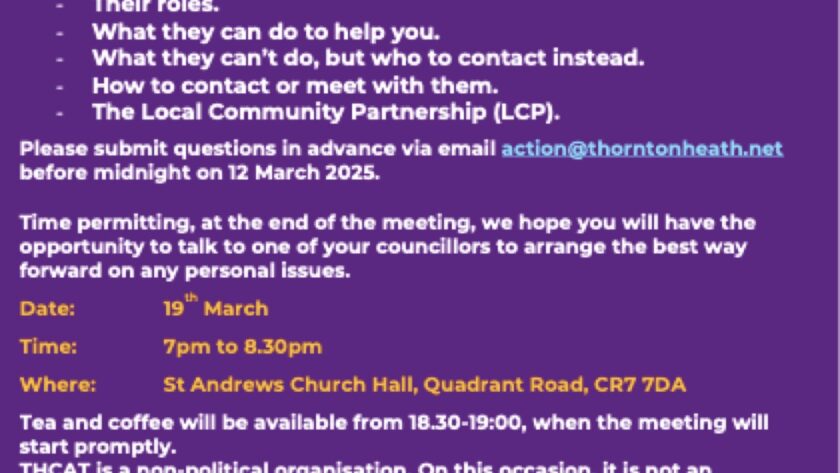 We’ve invited councillors from all three Thornton Heath wards to join us at our next THCAT meeting. This is your opportunity to: