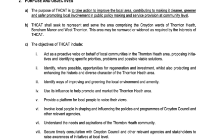 CONSTITUTION OF THORNTON HEATH COMMUNITY ACTION TEAM January 2015, revised June 2021 Draft August 2024 (proposed changes highlighted) 1. NAMEa) The name of the organisation shall be …